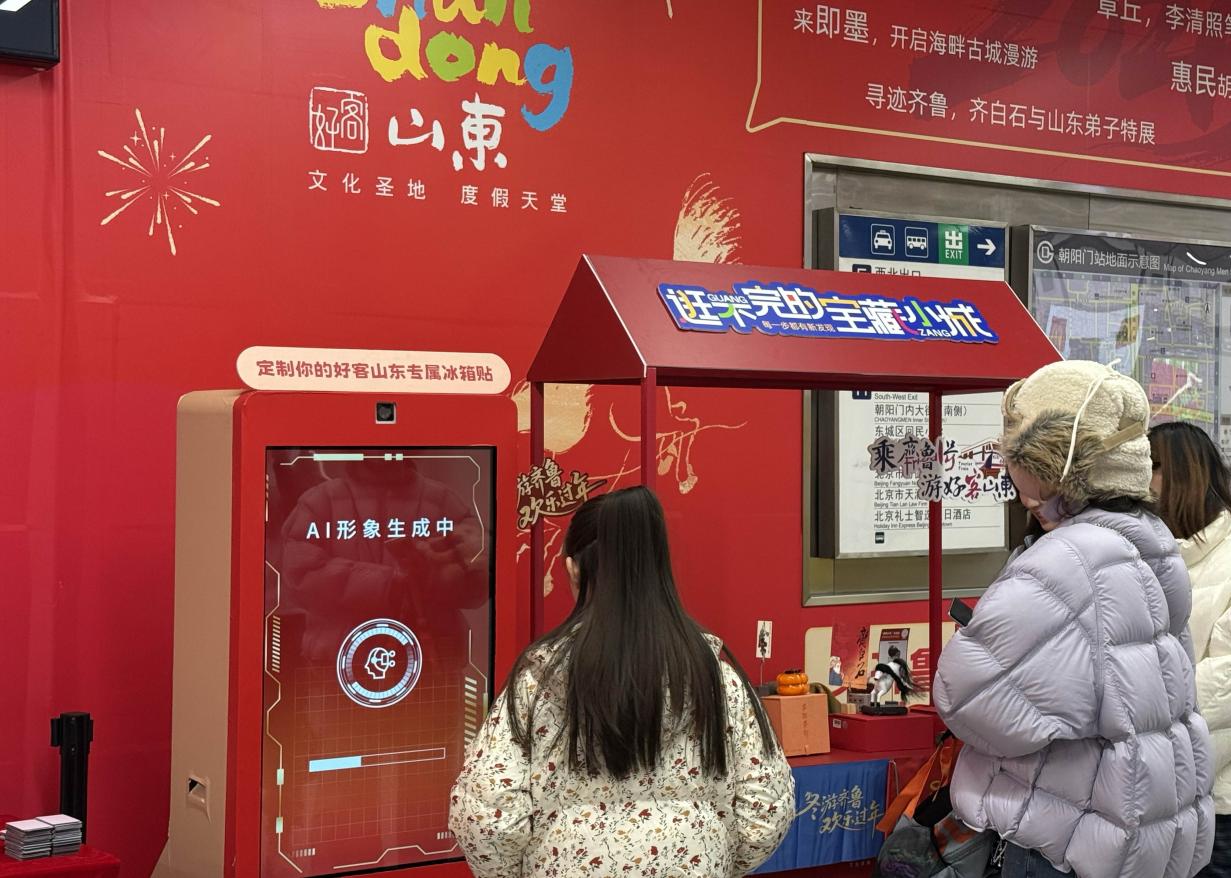 在“贴近山东,AI在其中”定制冰箱贴打印区,游客可通过AI拍照与山东各地地标景观虚拟合影,将山东人文自然风景浓缩于方寸之间,把齐鲁大地的美好带回家。