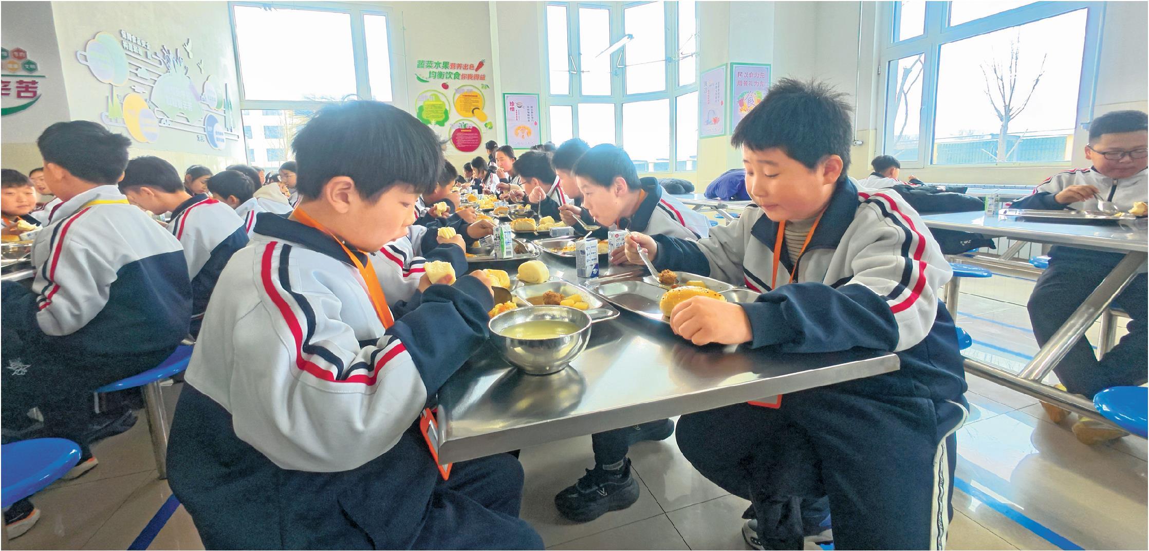 1月26日,安丘市实验小学青云湖校区学生在校园食堂享用营养午餐。