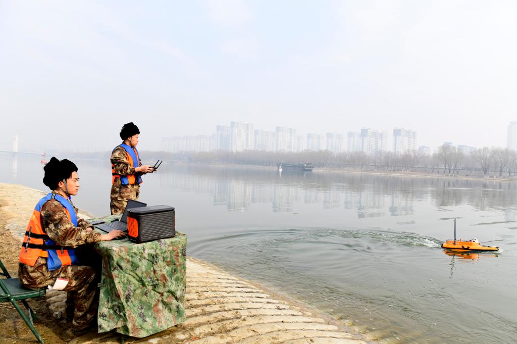 2月5日,在新(乡)兖(州)铁路梁济运河1号铁路特大桥水域,桥梁水下检测队的工作人员遥控水上机器人,探测作业水域河床地形。