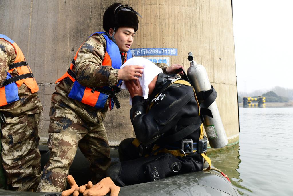 2月5日,在新(乡)兖(州)铁路梁济运河1号铁路特大桥,桥梁水下检测队的工作人员帮助完成桥墩水下检测作业的潜水员高佳旺擦干头发。