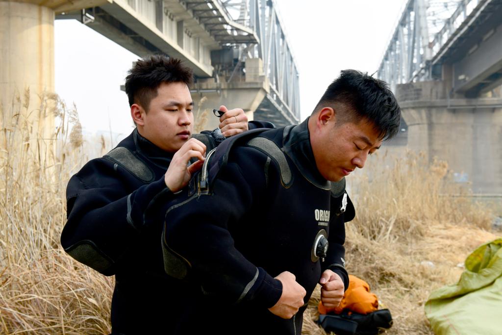 2月5日,在新(乡)兖(州)铁路梁济运河1号铁路特大桥水域,桥梁水下检测队的潜水员于竞博帮高佳旺(右)拉紧潜水服,准备下水作业。