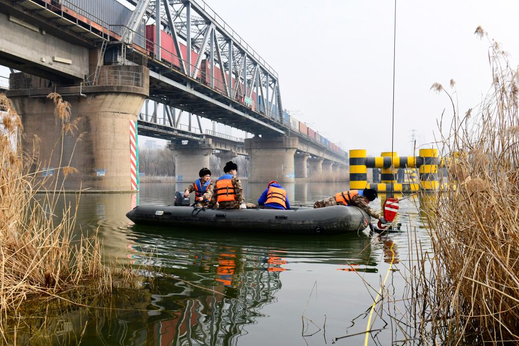 2月5日,在新(乡)兖(州)铁路梁济运河1号铁路特大桥,桥梁水下检测队工作人员将水下检测机器人吊运到指定水域。