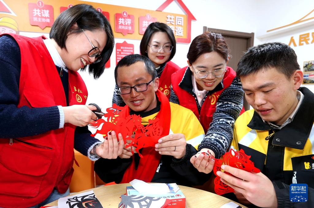 2月13日,新就业群体人员与爱心志愿者一起在山东省青岛市即墨古城暖“新”驿站剪纸。