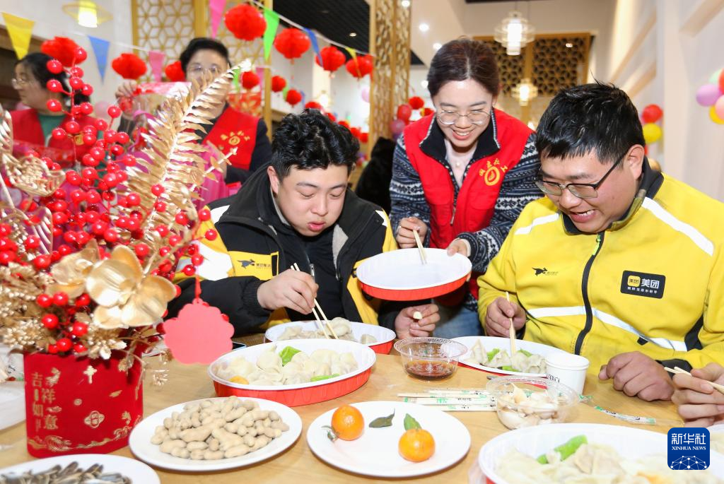 2月13日,新就业群体人员在山东省青岛市即墨古城暖“新”驿站餐厅吃饺子。