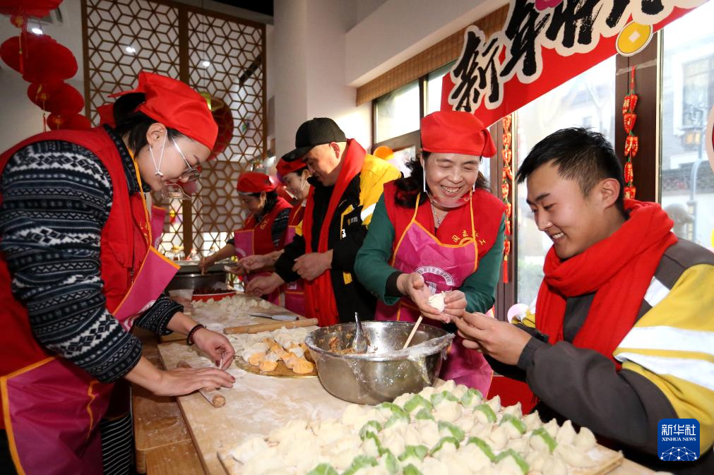 2月13日,新就业群体人员与爱心志愿者一起在山东省青岛市即墨古城暖“新”驿站餐厅包饺子。