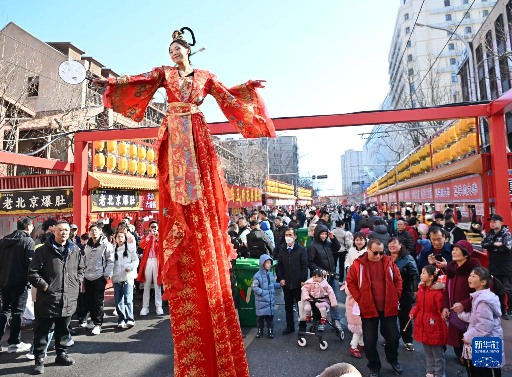 2月17日,游客在年货市集上观看表演。新华社记者 李紫恒 摄