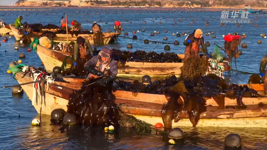 近日,山东省荣成市爱伦湾海洋牧场海带养殖区一派繁忙景象,养殖户对近岸养殖区达到成熟标准的海带分批及时收割,为后期收割的海带留出生长空间,以便提高海带的产量和质量。