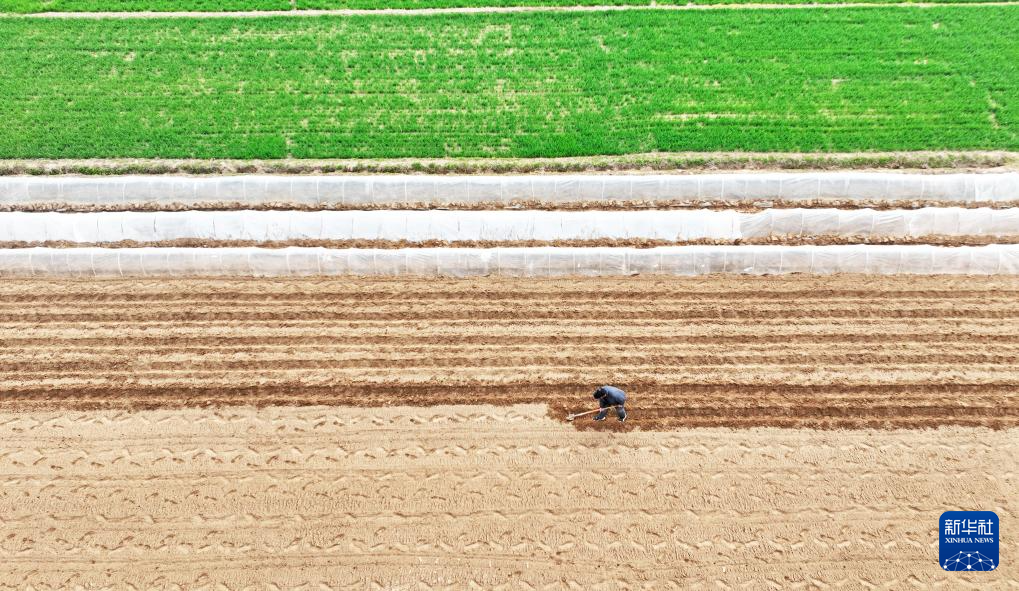 3月23日,在山东省临沂市郯城县郯城街道,农民在田间劳作(无人机照片)。新华社发(张春雷摄)
