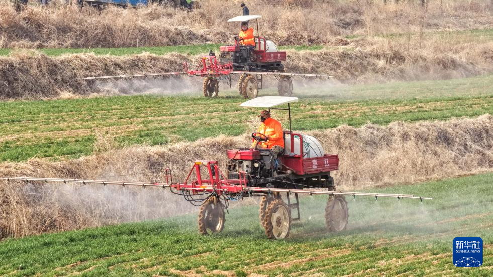 3月23日,在山东省荣成市虎山镇,农机手对小麦进行施肥和病虫害防控作业。新华社发(李信君摄)