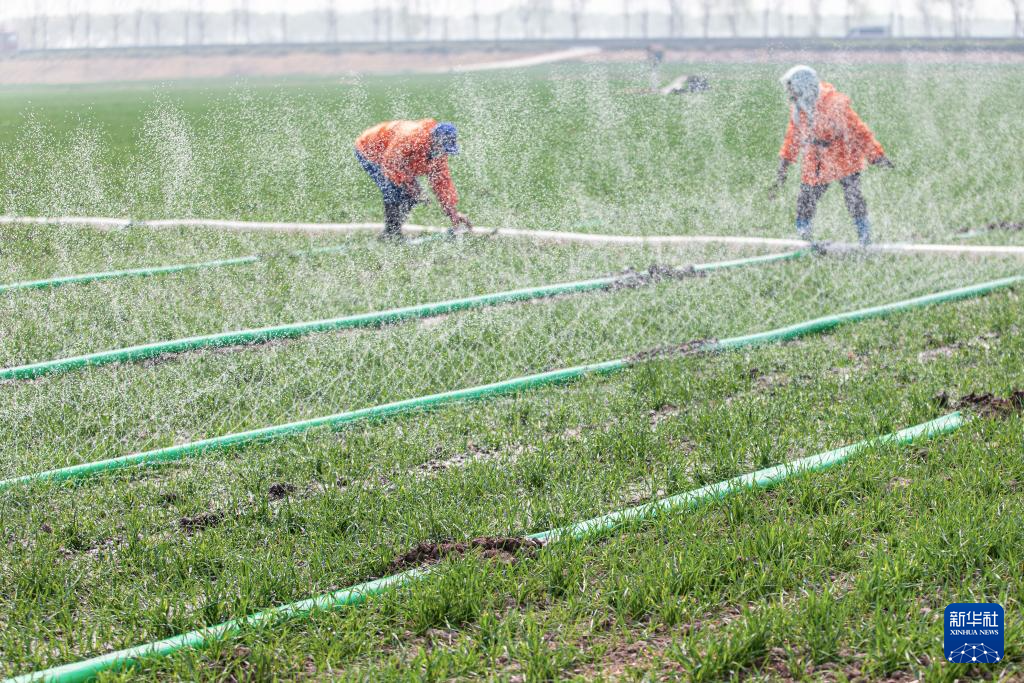 3月23日,在山东省聊城市茌平区冯官屯镇,农民给小麦铺设滴灌带。新华社发(马红坤摄)