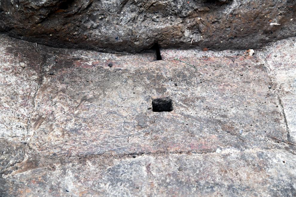 记者看到,现场还有一条南北向石铺道路,石块经过精细加工,形状规整,部分石块呈弧形凹面,整齐排列后路面一侧明显下凹。“这样它既是路,又是排水渠,一举两得。”吕凯说。