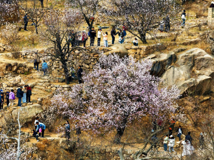 3月22日清晨,叩官镇大旺村周边数公里的道路上,密布的车流源源不断汇入。细细望去,不乏大批来自天津、江苏、青岛等省市的外地车牌,不少游客专程驱车赶来,只为赴这场繁花之约。