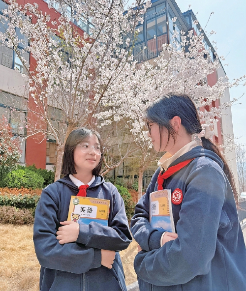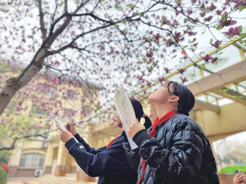 山东师范大学长清湖实验学校学生在繁花中学习、绘画。