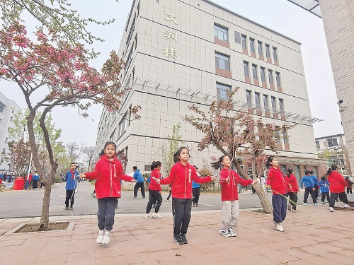 济南市文化东路小学学生在樱花树下跳绳,增强体质。