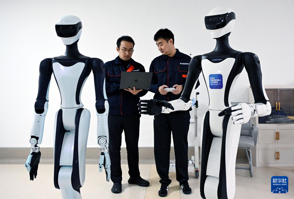 4月9日,在青岛市康养领域具身机器人暨智能康复类产品训练验证中心,训练师在对机器人进行场景训练。新华社记者 李紫恒 摄