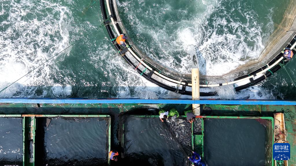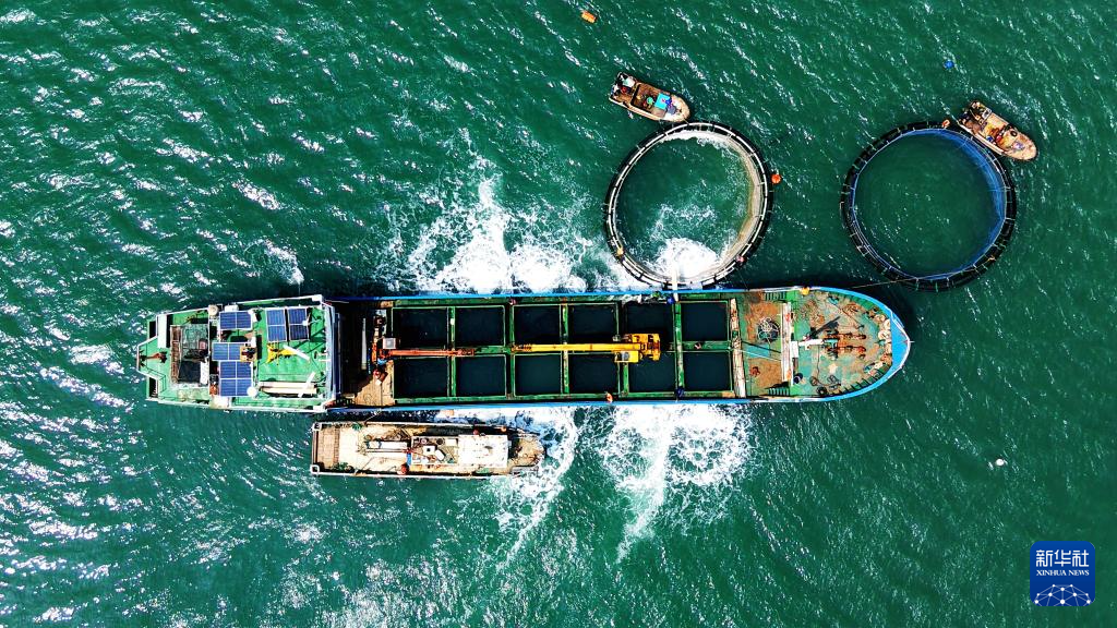 4月10日,山东青岛西海岸新区鲁海丰海洋牧场2026年首批10万尾鱼苗投入深水网箱进行养殖。据悉,青岛鲁海丰海洋牧场地处国家一类水质海域,水温适宜、盐度均衡,比较适宜海鱼生长。新华社发(俞方平摄)