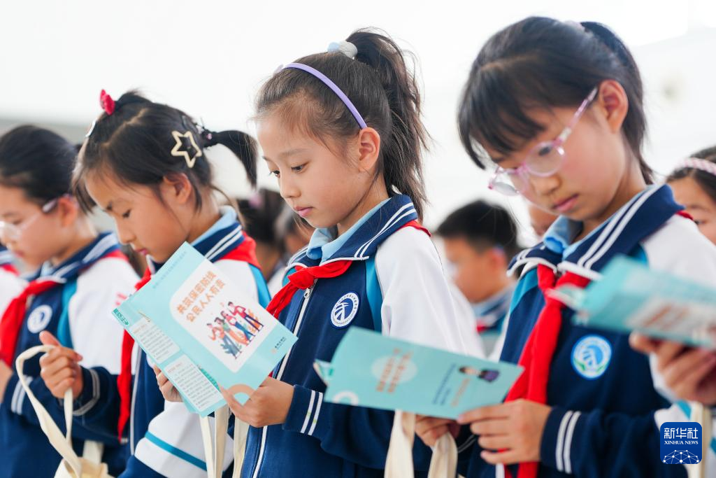 4月13日,在济南国际机场,学生在活动现场学习国家安全知识。新华社记者 朱峥 摄