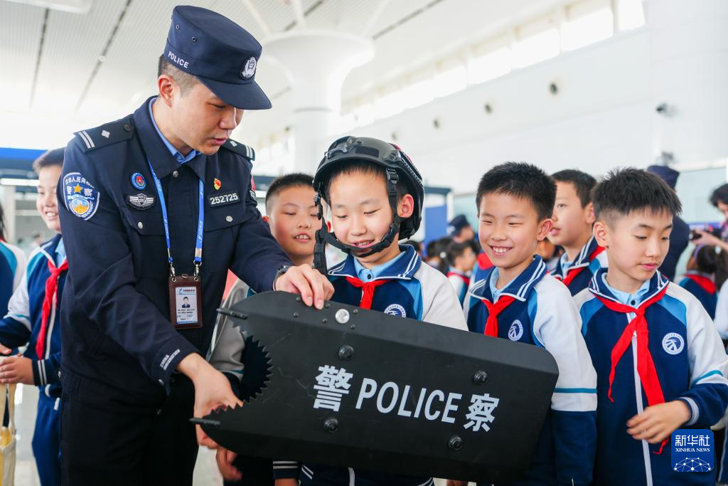 4月13日,在济南国际机场,学生在活动现场体验警用装备。新华社记者 朱峥 摄