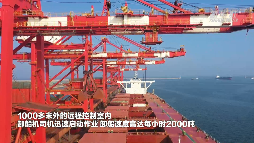 近日,一艘满载20万吨铁矿石的货轮停靠在山东港口日照港岚山港区。1000多米外的远程控制室内,卸船机司机迅速启动作业,卸船速度高达每小时2000吨。