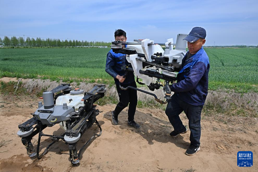 4月28日,在青岛市西海岸新区大场镇绿色增粮先行区,工作人员在搬运植保无人机。新华社记者 李紫恒 摄
