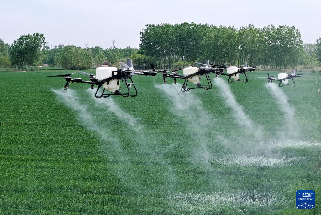 4月28日,在青岛市西海岸新区大场镇绿色增粮先行区,植保无人机准备开展“一喷三防”作业。新华社记者 李紫恒 摄